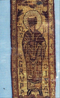 St. Cuthbert’s ceremonial robe Made from silk fabric with gold thread embroidery, these medieval “ceremonial robes” date back to the early 900s. They are among the earliest surviving embroidered works from this period in England and the only surviving pieces featuring full human figures.