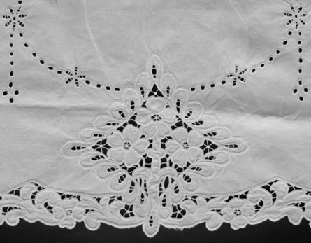 Hand-embroidered lace with braided thread edges.